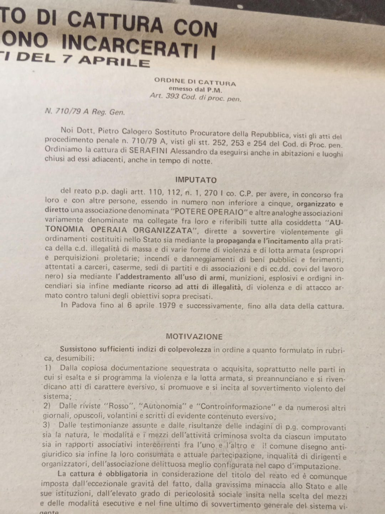 Padova, Roma, Milano, 7 aprile 1979. Il sostituto procuratore di Padova, Pietro Calogero, ha spiccato una ventina di mandati di cattura contro Potere Operaio e Autonomia Operaia. L’operazione è coadiuvata dal GI di Roma Achille Gallucci, impegnato nelle indagini per l’omicidio Moro. Arrestano redattori di giornali e radio, «cattivi maestri» e allievi, come Emilio Vesce, Oreste Scalzone, Toni Negri, Alessandro Serafini. A fine ’82 gli imputati a vario titolo nel processo 7 aprile saranno centinaia.